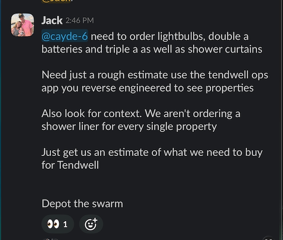 Practically, Cayde helps me run multiple businesses and everyone at our company knows Cayde and goes directly to Cayde for answers and help. See an example today where I asked Cayde for help below in my cleaning company: